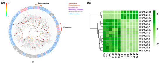Fourteen putative GR-encoding genes (AtumGR1-14) were identified (Supplementary Table S2: Sheet 3). Among these GR genes, AtumGR5, 6, 7, 10, 12, and 13 contained full length open reading frames, which encode putative proteins with 279 to 461 amino acids. A phylogenetic tree was built with GRs from A. tumida and other Coleopterans as well as D. melanogaster (Figure 3a). Proteins encoded by AtumGR6, 13, and 14 were grouped with Drosophila carbon dioxide receptors DmelGR21a and DmelGR63a [8], indicating that these genes were responsible for carbon dioxide sensing. AtumGR5 clustered within DmelGR43a [41], which has been shown to detect sugars in D. melanogaster. In addition, most of the remaining AtumGRs were assigned to two phylogenetic group with GRs of B. melanopus and C. formicarius. In addition, 11 AtumGRs were relatively high in the FA and MA, while two AtumGRs (AtumGR10 and 13) were more highly expressed in the FL and ML (Figure 3b). The expression of the genes encoding putative carbon dioxide receptor (AtumGR14) was the highest in antennae. The expression of a gene encoding an unknown GR (AtumGR10) was the highest in forelegs (Supplementary Table S4).