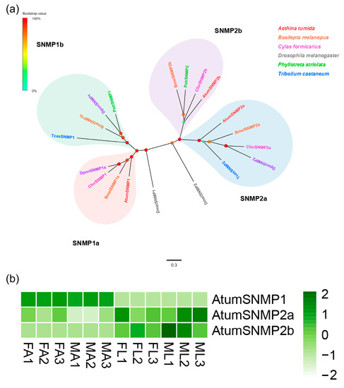 Three putative SNMP-encoding genes were identified, which contained full-length ORFs and two TMDs (Supplementary Table S2: Sheet 4). Four distinct groups, namely SNMP1a, SNMP1b, SNMP2a, and SNMP2b, were observed in a phylogenetic tree generated with our identified sequences and paralogs from other Coleopterans and D. melanogaster (Figure 4a). AtumSNMP1, 2a and 2b were classified into SNMP1a, SNMP2a, and SNMP2b groups, respectively. In terms of expression, AtumSNMP1 was expressed at relatively high levels in FA and MA, while AtumSNMP2a and 2b expressed highly in the FL and ML (Figure 4b).