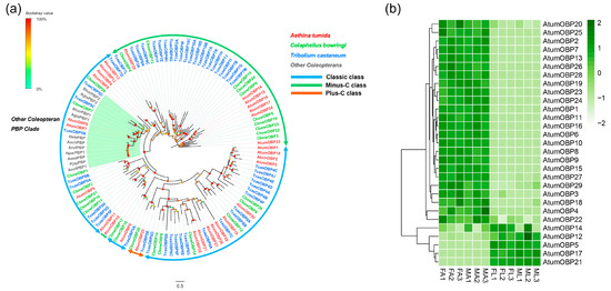 Analyses of putative odorant-binding proteins (OBPs) in A. tumida. (a) Maximum-likelihood tree of putative OBPs. Circles at the branch nodes represent bootstrap values based on 1000 replicates. Scale bar represents the 0.5 amino acid substitutions per site. Classic OBPs are in blue; Minus-C OBPs in green; Plus-C OBPs in orange. The Coleopteran PBP clade is highlighted as green. (b) Heatmap of OBPs based on antennae and forelegs transcriptome data in A. tumida. FA, female antennae; MA, male antennae; ML, male forelegs; FL, female forelegs. The transcript abundance was measured by FPKM-values.