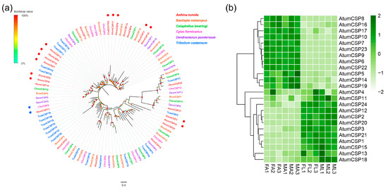 Analyses of putative chemosensory proteins (CSPs) in A. tumida. (a) Maximum-likelihood tree of putative CSPs. Circles at the branch nodes represent bootstrap values based on 1000 replicates. Scale bar represents the 0.4 amino acid substitutions per site. (b) Heatmap of CSPs based on antennae and forelegs transcriptome data in A. tumida. FA, female antennae; MA, male antennae; ML, male forelegs; FL, female forelegs. The transcript abundance was measured by FPKM-values.