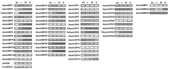 Expression profile of OBPs, CSPs and SNMPs in different tissues. Genes specifically or mainly expressed in antennae are marked with red dots. GAPDH and E-cadherin genes were used as internal reference to test the integrity of each cDNA template. A, antennae; L, foreleg tarsus; W, wings; G, genitals.