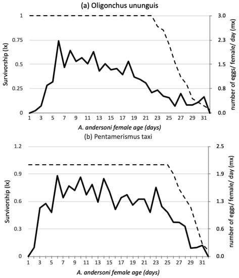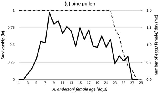 Age-specific survival rate (mx-dashed line) and fecundity (lx-solid line) of Amblyseius andersoni females reared on (a) Oligonychus ununguis, (b) Pentamerismus taxi and (c) Pinus sylvestris pollen.
