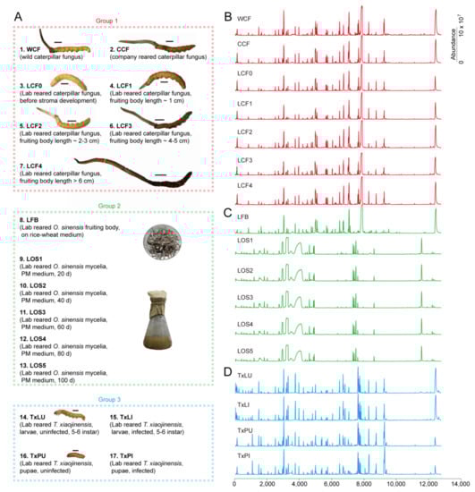 Group setups and example traces of treatments. (A) Definition of groups. Group 1 included wild and reared cordyceps. Group 2 included reared fruiting body and mycelia of O. sinensis. Group 3 included T. xiaojinensis insect host. Detailed descriptions and identifiers for the treatments were provided in Table S1. Each treatment contained n = 50 samples and 3 replicates. (B) Traces show treatments of caterpillar fungus (WCF, CCF, LCF0, LCF1, LCF2, LCF3 and LCF4). (C) Traces show treatments of reared O. sinensis alone (LFB, LOS1, LOS2, LOS3, LOS4 and LOS5). (D) Traces show treatments of host insects T. xiaojinensisi alone (TxLU, TxLI, TxPU and TxPI).
