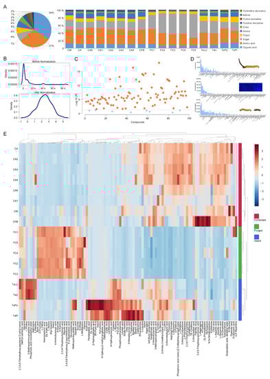 Evaluation of metabolite profiles from the tested treatments. (A) The pie chart showed overall proportions of the metabolite classes identified in all products. The bar chart showed the proportions of the same metabolite classes in each treatment from either Chinese cordyceps, O. sinensis alone or Thitarodes alone. (B) Kernel density plots before and after data normalization. Normalization was performed using the generalized log transformation method. (C) Comparison of means for the 98 identified metabolites. Most metabolites showed significant differences in concentrations among groups (ANOVA, red dots, p < 0.05). No significant difference was observed for 8 metabolites including boric acid, erythritol, kynurenine, L-leucine, putrescine, D-gluconic acid, butanedioic acid dimethyl ester and 2,3,4,5-tetrahydroxy-pentanal O-ethyl-oxime (ANOVA, blue dots, p > 0.05). (D) Bar charts showed the concentrations (mg/kg) of 98 metabolites in cordyceps, mycelium and insects. Error bars indicate + SD. (E) Heatmap plots showed the distributions of data cells across treatments and metabolites. Distance measurement was by Pearson correlation, and the clustering algorithm was complete.
