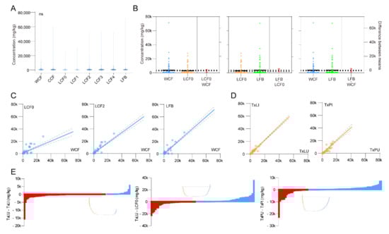 Stage, spatial and infection effectiveness on metabolites. (A) Overall comparison of metabolites among WCF, CCF, LCF0~4 and LFB. (ANOVA, F7, 776 = 0.386, p = 0.91) (B) Estimation plots using t tests between selected samples. Color indicates sample category. Error bars indicate S.E.M. No significant difference was observed in 3 tested pairs. (Students’ t test, LCF0-WCF: t194 = 0.79, p = 0.43; LCF0-LFB: t194 = 0.79, p = 0.43; LFB-WCF: t194 = 0.03, p = 0.97) (C) Linear regression between selected samples for development effectiveness. Dotted lines indicate 95% C. I. Significant regression was found in all pairs. (Linear regression, LCF0-WCF: F1, 96 = 109.0, r2 = 0.53, p < 0.0001; LCF2-WCF: F1, 96 = 553.7, r2 = 0.85, p < 0.0001; LCF2-WCF: F1, 96 = 669.0, LFB: r2 = 0.87, p < 0.0001) (D) Linear regression between selected samples for infection effectiveness. Dotted lines indicate 95% C. I. Significant regression was found in all pairs. (Linear regression, TxLI-TxLU: F1, 96 = 1799, r2 = 0.95, p < 0.0001; TxPI-TxPU: F1, 96 = 340.4, r2 = 0.78, p < 0.0001) (E) Comparison of each metabolite among selected samples for assessment of infection effectiveness. Waterfall plots were developed using minus of selected sample pairs. Red bars indicate up-regulated metabolites, and blue bars indicate down-regulated metabolites.