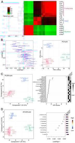 Clustering and group discrimination of samples. (A) Correlation matrix of treatments. Dendrogram was obtained using hierarchical clustering from the metabolic profiling in the fruiting body (red), insect (blue) and mycelium (green). (B) Loading plot (left) and scores plot (right) from principal component analysis (PCA) between the selected PCs. Circle indicates 95% C.I. (C) Partial least squares—discriminant analysis plot (PLSDA, left) and top 25 featured metabolites identified by PLSDA (right). The circle indicates 95% C.I. Boxes on the right indicate the relative concentrations of the corresponding metabolite in each group. (D) Sparse PLSDA (sPLSDA) plot (left) and loading plot (right) showing the top 10 variables selected by the sPLSDA model for component 1. The variables are ranked by the absolute values of their loadings. The circle indicates 95% C.I. Boxes on the right indicate the relative concentrations of the corresponding metabolite in each group.