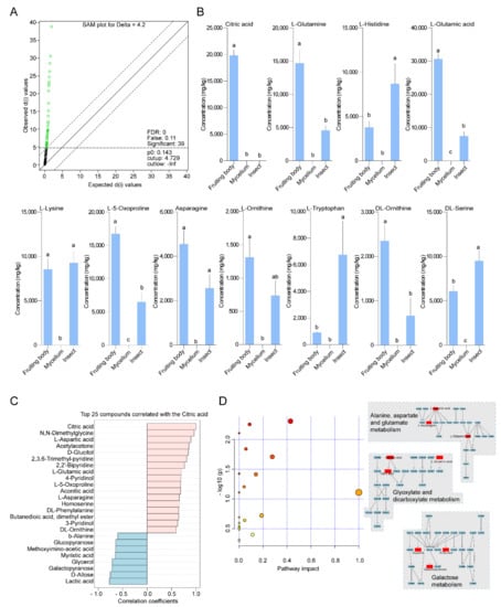 Featured fruiting body metabolites and pathway predictions. (A) Significance analysis of metabolomics (SAM) method addressing the false discovery rate (FDR) at Δ = 4.2 to identify featured metabolites. List of featured metabolites was in Table S5. (B) Comparison of means in concentrations of the top 11 featured metabolites among groups. Lower-case letters indicate significant differences of concentrations in metabolites observed from groups of fruiting body, mycelium and insect (GLM and Tukey HSD, p < 0.05). (C) Top 25 compounds correlated with the citric acid identified by Patternhunter. The selected metabolites represented the most promising metabolites which shared significantly higher abundances in fruiting bodies other than in mycelia or insects. (D) Summary of pathway analysis using the metabolites from (C). Pathways involving more given metabolites were listed on the right, including alanine/aspartate/glutamate metabolism, glyoxylate/dicarboxylate metabolism and galactose metabolism.
