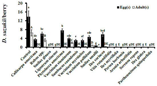 No-choice Assays.D. suzukii oviposition after 48 hr exposure and adult eclosion per berry (Mean ± SEM) in 2015. Oviposition (F17, 900 = 59.59, p < 0.0001) and adult eclosion (F17, 900 = 73.94, p < 0.0001) analyzed using one-way ANOVA. Within a given developmental stage (egg or adult) bars with the same letter are not significantly different (p ≥ 0.05).