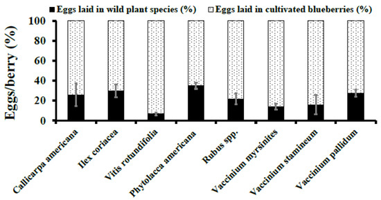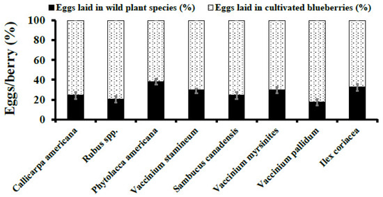 In 2016, oviposition of D. suzukii eggs in P. americana berries (8.10 ± 3.06) was statistically similar to V. stamineum, I. coriacea, and V. myrsinites and significantly higher when compared to Rubus spp., S. canadensis, V. pallidum, and C. americana (F7, 190 = 3.88, p = 0.0006). The proportion of D. suzukii eggs deposited into cultivated blueberries was statistically higher than all wild fruit species except I. coriacea (F1, 40 = 3.89, p = 0.0558) (Figure 3 and Figure 4).