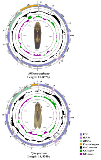 Circular maps of the mitogenome of Mileewa rufivena and Ujna puerana.