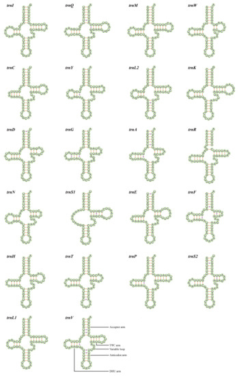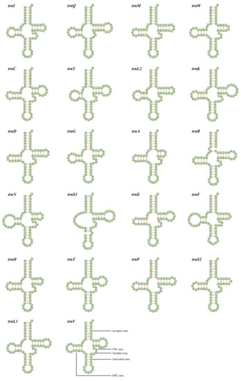 Putative secondary structure for the 22 tRNAs of Mileewa rufivena.