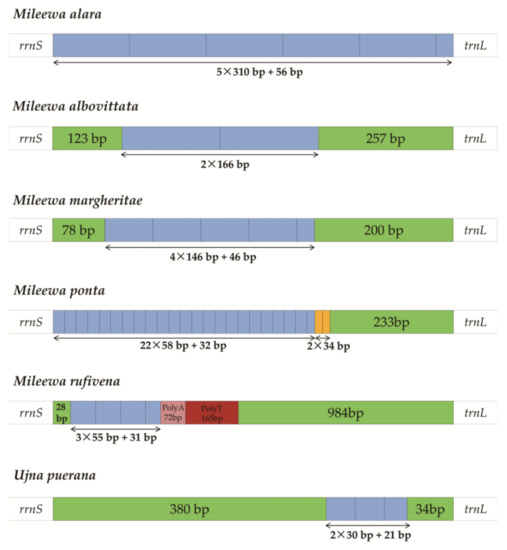 These regions have several regulatory elements that may have a significant function in the origination of replication and transcription [2,4]. The repeat sequences vary in different mitogenomes (Figure 6). M. alara had the longest tandem repeat units with a size of 310 bp, while the shortest is in U. puerana at only 30 bp. M. ponta has 22 repeating units of 58 bp and another two repeat tandem units of 34 bp. The other three Mileewinae species have a relatively long size, ranging from 55 bp to 166 bp. In addition, Poly A/T stretches were only found in M. rufivena. The length and number of repeat units in Mileewinae are different, and we could not find any connection among them. More mitogenomes could be sequenced or more advanced methods may become available to figure out how to resolve this issue in the future.