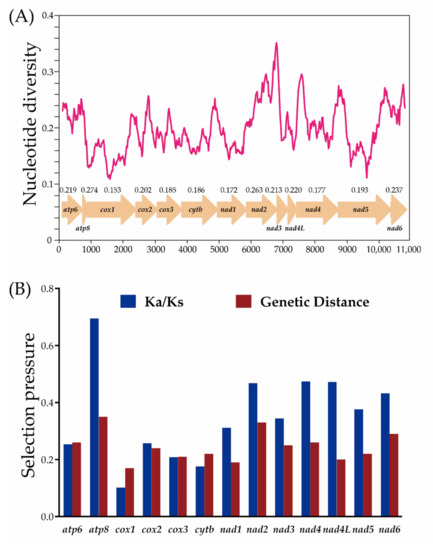 The nucleotide diversity of the 13 PCGs genes among our six mileewines is displayed in Figure 7A. The four with the distinctly highest variability were ATP8 (Pi = 0.274), ND2 (Pi = 0.263), ND6 (Pi = 0.237) and ND4 (Pi = 0.220), while COX1 (Pi = 0.153), ND1 (Pi = 0.172), ND4L (Pi = 0.177) and COX3 (Pi = 0.185) exhibited relatively low Pi values.