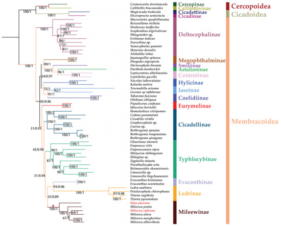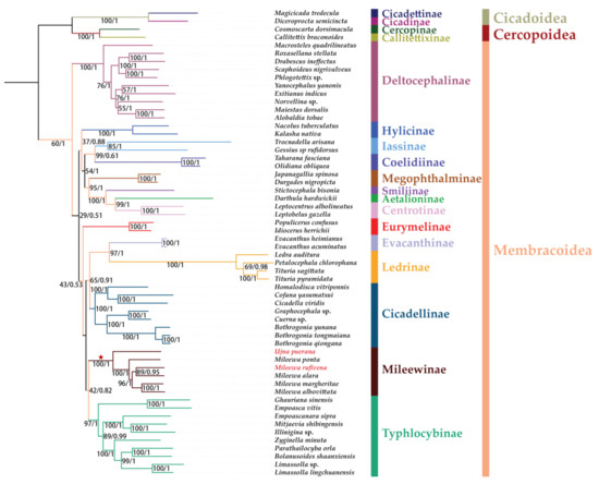 Classification of this group has been unstable over the past few decades, and previous scholars have held disparate views. Mileewini was established by Evans (1947) and placed it in the Cicadellinae (as “Tettigellinae”) [9]. Young (1965) transferred this tribe from Cicadellinae to the subfamily Typhlocybinae [10]. However, this placement by Young was doubted by Mahmood (1967), and he moved this tribe back into Cicadellinae in his later related work [11]. Young (1968) first elevated Mileewinae to status as a separate subfamily, and this status has been accepted by several subsequent authors. Dietrich (2005) also accepted this perspective in his taxonomic study of the Cicadellidae family [12,13]. Then, Dietrich (2011) redescribed this group based on phylogenetic analyses of both molecular and morphological data, suggesting Mileewini and another three tribes (Makilingiini, Tinteromini and Tungurahualini) represented a monophyletic group, meanwhile treating Mileewinae as tribes of a single subfamily [7]. However, there are still many different opinions about the classification of Mileewinae, and the relationships among Cicadellinae, Typhlocybinae and Mileewinae have not yet been stated explicitly. In previous studies, three complete (M. albovittata, M. margheritae and M. ponta) mitogenomes and a partial mitogenome (M. alara) of Mileewa have been reported [14,15,16,17]. Analysis based on these mitochondria supported that Mileewinae was monophyletic, but it did not analyze the relationships between Mileewinae and other subfamilies.