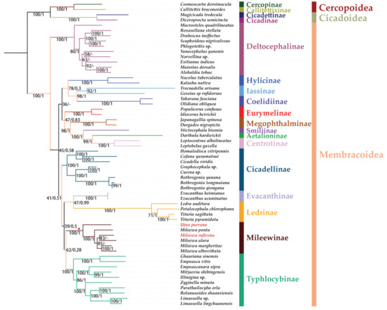 - Song, N.; Cai, W.; Li, H. Deep-level phylogeny of Cicadomorpha inferred from mitochondrial genomes sequenced by NGS. Sci. Rep. 2017, 7, 11. [Google Scholar] [CrossRef]
