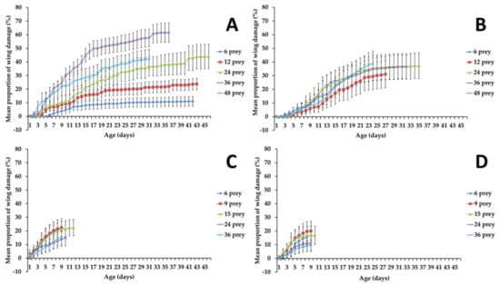 The mean proportion of damaged wings of C. attenuata females fed on D. melanogaster and males fed on B. impatiens or D. melanogaster did not differ significantly between prey densities at early ages (day 4) (F4, 220 = 1.27, p = 0.2826; F4, 220 = 1.55, p = 0.1886; F4, 220 = 2.4, p = 0.0513, respectively) (Figure 1B–D). However, C. attenuata females fed 48 adults of B. impatiens daily lost more wings compared with those fed 12 adults of B. impatiens daily on day 4 (F1, 88 = 9.39, p = 0.0029, Bonferroni-corrected p = 0.005) (Figure 1A). The wing damage increased with age in every case, but at different rates depending on prey species and density. When fed with B. impatiens, C. attenuata females showed significant differences at late age (31 days) between prey densities of 12 and 24 (F1, 88 = 13.15, p = 0.0004, Bonferroni-corrected p = 0.005), or between prey densities of 36 and 48 (F1, 88 = 10.16, p = 0.002, Bonferroni-corrected p = 0.005) (Figure 1A). For C. attenuata males, there were no significant differences between prey densities at late age (19 days) (F4, 220 = 0.63, p = 0.6425) (Figure 1B). When fed with D. melanogaster, both females and males of C. coenosia did not show significantly different wing damage between prey densities at later age (8 days) (F4, 220 = 2.08, p = 0.0848; F4, 220 = 2.07, p = 0.0856, respectively) (Figure 1C,D).
