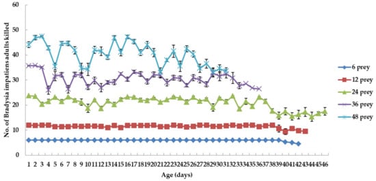 Mean number of prey killed per C. attenuata adult when fed 6, 12, 24, 36 and 48 adults of B. impatiens daily per predator adult (values are mean ± SE, single values were present when only one adult C. attenuata was left in the end).
