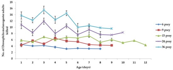 Mean number of prey killed per C. attenuata adult when fed 6, 9, 15, 24 and 36 adults of D. melanogaster daily per predator adult (values are mean ± SE, single values were present when only one adult C. attenuata was left in the end).