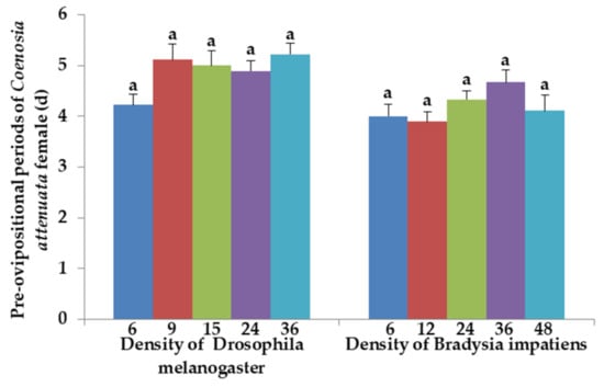 Preovipositional periods of C. attenuata female adult when fed 6, 9, 15, 24 and 36 adults of D. melanogaster and 6, 12, 24, 36 and 48 adults of B. impatiens daily per predator adult. Different letters above each bar indicate significant differences between prey densities using one-way ANOVA, Tukey’s HSD test (p = 0.05 and n = 9).