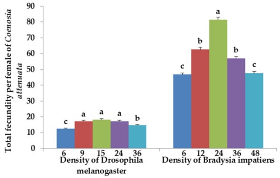 Total fecundity per female of C. attenuata when fed 6, 9, 15, 24 and 36 adults of D. melanogaster and 6, 12, 24, 36 and 48 adults of B. impatiens daily per predator adult. Different letters above each bar indicate significant differences between prey densities (corrected p value for multiple testing by Bonferroni correction is 0.005 and n = 9).