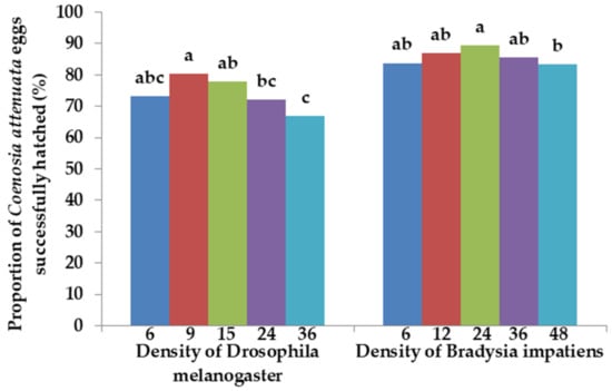 Proportion of eggs successfully hatched for C. attenuata when fed 6, 9, 15, 24 and 36 adults of D. melanogaster and 6, 12, 24, 36 and 48 adults of B. impatiens daily per predator adult. Different letters above each bar indicate significant differences between prey densities at a 0.01 level of significance using Chi-square test (n = 450, first 50 eggs were collected from each cage, 9 repetitions in each treatment).