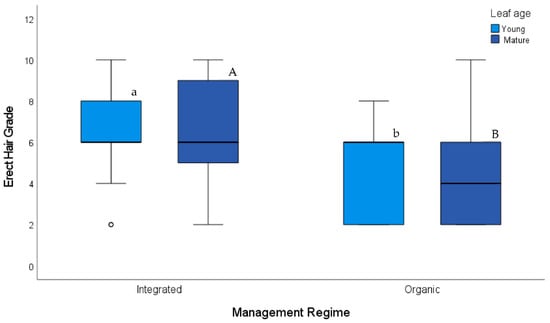 Variety-dependent erect hair grades (representing the sum of grades on the blade and main veins) of the leaf underside in vineyards under integrated and organic pest management regimes sampled by [1]. Thick horizontal lines represent the median, boxes represent the interquartile (IQ) range, whiskers are 1.5 times the IQ range, symbols depict the outliers. Different small and capital letters on top of boxes indicate significant differences in leaf hairiness of sampled vineyards under integrated and organic pest management (n = 16 for each pest management regime and leaf age category; Mann–Whitney U-tests p < 0.05).