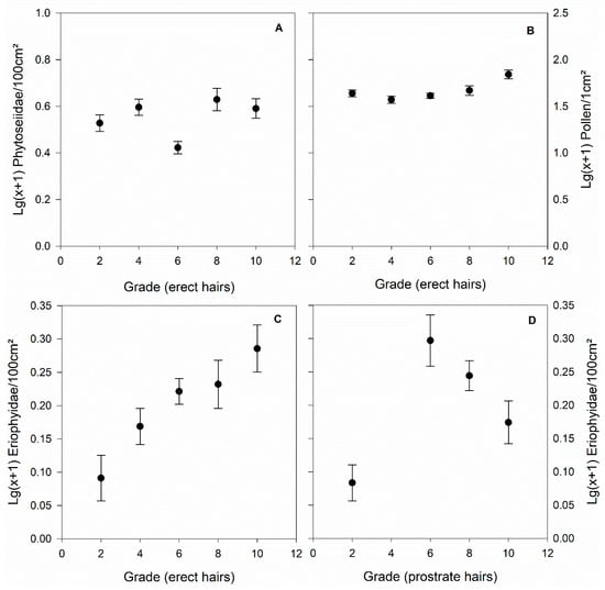 Significant influence of erect and prostrate hair grades of the leaf underside on phytoseiid (A) and eriophyid (C,D) abundance and pollen deposition (B) (mean ± SE) in vineyards sampled by [1]. Figures visualizing all significant explanatory variables in GLMs on phytoseiid, tydeid and eriophyid abundance as well as pollen deposition are provided in the Supplementary File (Figures S1a,b, S2a,b, S3 and S4).