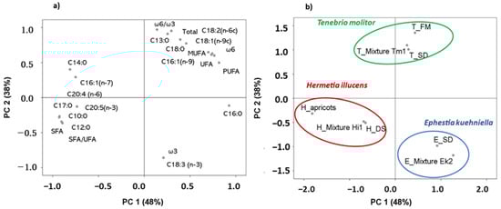 Scattering the data of fatty acids and lipid indices by the first two principal components (PC1 and PC2): analysis of different insect species fed different diets. (a) Biplot of the first two components created considering fatty acids and lipid indices; (b) rotated principal scores of insect species and their corresponding diets projected onto the first two principal components.