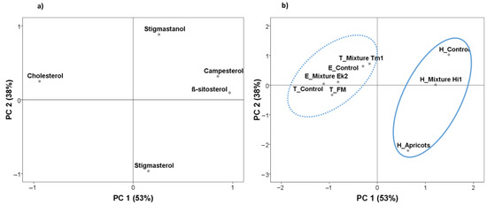 Scattering the data of sterols by the first two principal components (PC1 and PC2): analysis of different insect species fed different diets. (a) Biplot of the first two components created considering sterols; (b) rotated principal scores of insect species and their corresponding diets projected onto the first two principal components.