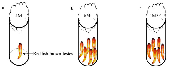 Testes are a sperm production organ and their relative size or mass may be an indicator of sperm production. Evidence shows that male insect larvae, in the growth and development stage, can adjust their testis size in response to conspecific larval cues, regardless of sex. For example, with the increase in larval density, testis size increases in some species, suggesting an increase of sperm production (sperm were not counted though) [17,39,40]. In a study where testis size is measured and sperm are counted [19], the male larvae exposed to larval cues, regardless of sex, produce smaller testes but more fertile sperm. These discoveries suggest that in response to their social environment, male larvae are able to dedicate varying portions of testis volumes to spermatogenesis and other functions [41], resulting in potential trade-offs between traits of different functions [19,42,43,44]. However, there is no report that insects can alter their testis size in response to the socio-sexual environment experienced at the adult stage. This may be because most resource allocation to traits making up the adult body takes place during growth and development [42,43,45,46,47,48], leaving little room for adults to change their testis morphology. To date, it is not clear whether insect pupae can alter their testis size after exposure to different socio-sexual environments.