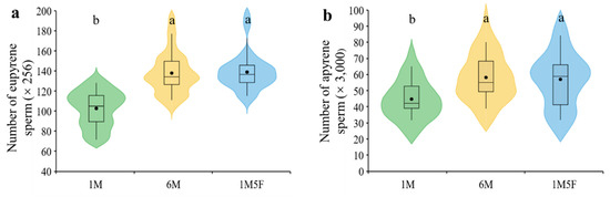 Effect of socio-sexual environment during the pupal stage on the number of eupyrene (a) and apyrene (b) sperm in testes of E. kuehniella. 1M, one male; 6M, six males together; 1M5F, one male and five females together. Each box plot shows the range between the first and third quartiles (black box), mean (black dot) and median scores (black lines); and ‘violin’ shapes show the shape of the distribution. Different letters on the top of the shapes denote significant differences between treatments (p < 0.05).