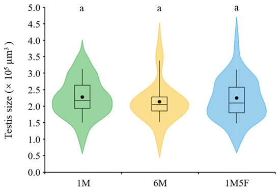Effect of socio-sexual environment during the pupal stage on testis size of E. kuehniella. 1M, one male; 6M, six males together; 1M5F, one male and five females together. Each box plot shows the range between the first and third quartiles (black box), mean (black dot) and median scores (black lines); and ‘violin’ shapes show the shape of the distribution. The same letters on the top of the shapes denote no significant differences between treatments (p > 0.05).