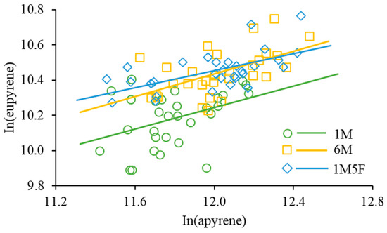 Relationship between the number of eupyrene and apyrene sperm produced. For 1M (one male), ln(eupyrene) = 6.58 + 0.31 × ln(apyrene), R2 = 0.1594; for 6M (six males together), ln(eupyrene) = 6.59 + 0.32 × ln(apyrene), R2 = 0.2990; and for 1M5F (one male and five females together), ln(eupyrene) = 7.54 + 0.24 × ln(apyrene), R2 = 0.3729.