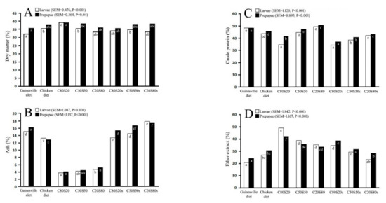 The rearing substrate has a direct impact on the nutritional composition of BSF larvae and prepupae [15,16,25]. The chemical composition of the mixed organic diet and that of the BSF larvae and prepupae in this study demonstrate that the CP content in the rearing diet influences BSF larval and prepupal protein content. A high CP content in the diet produced a high protein content in larvae, a result similar to that of other studies [16]. Nitrogen-free extract (NFE) in the diet is positively correlated to the fat content in BSF larvae [25]. In this study, the increment of NFE in the mixed organic diet promoted a higher fat content in BSF larvae than in another study [15]. In addition, larvae reared on a diet high in soluble carbohydrates (618 g/kg) had the highest fat content (386 g/kg DM), whereas those reared on a diet low in soluble carbohydrates (7 g/kg) had the lowest fat content (218 g/kg DM), because insect larvae can convert excess carbohydrates to fat and store it in their body mass [16].