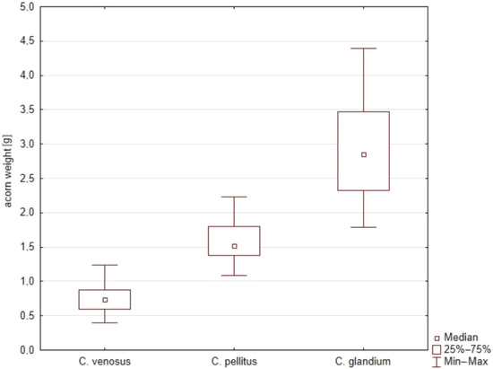 The general characteristics of acorn selection by Curculio spp. females are shown in Table 1. Generally, females of C. venosus were rarely interested in drilling into the heaviest acorns. Their eggs were found in the smallest fruits, with weight <1 g (median 0.741 g). Females of C. pellitus preferred bigger acorns, usually with weight around 1.5 g (median 1.519 g), sometimes choosing the biggest ones. Curculio glandium females, in turn, drilled in all kinds of acorns but laid eggs only into the biggest ones, with a mass over 2.5 g (median 2.852 g). Kruskal–Wallis’ test revealed a significant (post-hoc, p < 0.05) difference in the selection of acorns in terms of weight by females of the three species. Dunn’s post-hoc test showed that the lightest acorns were selected significantly more often by female C. venosus (post-hoc, p < 0.05) than by females of the other species. Curculio glandium females selected the acorns of the significantly largest masses (post-hoc, p < 0.05). The above differences are illustrated in Figure 2.