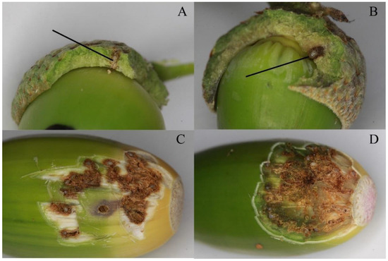 Typical view on oviposition sites in acorns infested during the first experiment: (A,B) C. venosus; (C,D) C. glandium. Curculio venosus usually lays one egg per acorn (marked with an arrow), always into cupula. Contrary, C. glandium can oviposit few (even 10 or more) eggs into one acorn, just below the outer skin, and not into the cupula.