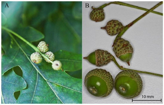 Acorns in the early stage of growth: (A) fruits in June are usually very small—taken on 16 June 2014, (B) acorns during growth vary in size and shape between trees—photo taken on 8 July 2014.