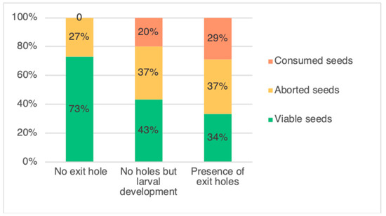 The two categories of pods, with an exit hole and without an exit hole but with presence of larvae (Figure 1), were then pooled as infested pods and compared with uninfested pods. In total, L. argentatum infested around 64% of the sampled pods, with a portion of these showing signs of adult emergence, with up to five exit holes being observed. There was a total of 497 (61%) pods with an exit hole, 287 (36%) pods without an exit hole and 26 (3%) pods without an exit hole but hosting a feeding L. argentatum larva. After pod dissection, the different seed categories are presented in Figure 2. In pods exhibiting exit holes, there was between one and five exit holes per pod (Table 1). Following dissections, the average number of seeds per pod was 5.9 ± 0.69 (SD). Of the 4783 seeds counted, 47% were viable. The number of aborted seeds (1616; 34%) was greater than the number of seeds consumed by L. argentatum (902; 19%) (p-values = 2.2×10−16). For per-pod seed consumption, 33,21%, 20.61%, 7.16%, 2.59%, and 0.86% of pods dissected had one, two, three, four, or five consumed seeds, respectively. Only one pod had six seeds consumed. In total, 18.86% of all seeds were destroyed (direct impact related to seed feeding), which is about a fifth of the total. The seed germination test, found zero germination for aborted seeds (n = 75), and 80% germination for viable seeds (n = 100).
