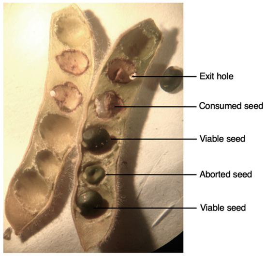 Dissection of a Genista monspessulana (Fabaceae) pod containing, viable, aborted and consumed seeds by Lepidapion argentatum (Coleoptera, Brentidae).