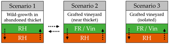 Possible phylloxera populations scenarios in commercial vineyards on leaves (green) and roots (brown) of rootstock hybrids (RH), V. vinifera (Vin), and fungus-resistant varieties (FR). Dashed arrows represent potential annual migration pathways of phylloxera larvae.
