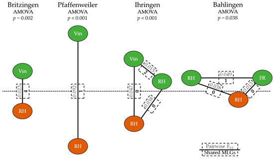 A similar pattern was visible for the pairwise fixation index comparison. The vineyards in Britzingen and Pfaffenweiler showed low fixation indices of 0.02 and 0.09, between their leaf- and root-feeding populations (Figure 2). The same figure shows that the AMOVA tests between leaf and root phylloxera populations in both vineyards were nonetheless significantly different from one another. For Ihringen, though the fixation index between RH root-feeding and VIN leaf-feeding in the vineyard was also small, it was three times higher than that of the pairwise comparison between Vin and RH leaf-feeding populations in the nearby thicket. The leaf-feeding FR population in Bahlingen had the lowest fixation index with its RH root-feeding population, which was 0.01. This value was four times lower than the comparison between FR and RH leaf-feeding populations. The AMOVA test p-value in Bahlingen was also the highest of the four vineyards; however, the subpopulations were still significantly distinct from one another. The overall FST value between the subpopulations of all four vineyards was 0.12 (i.e., 88% of the genetic variation was within the subpopulations).