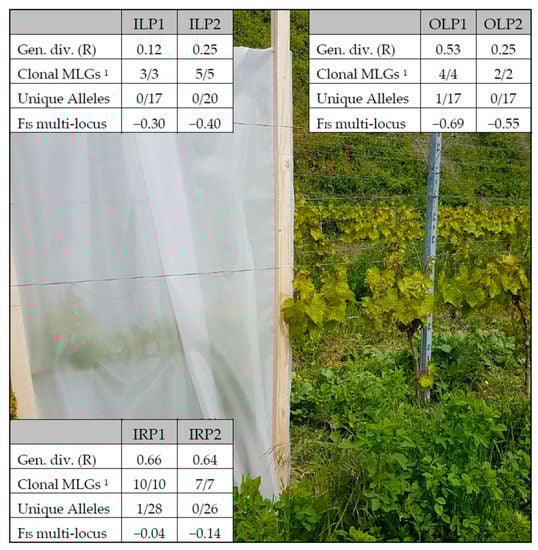 Forneck et al. [21] and Tello et al. [31] (who used the same SSR markers as in this study) found FIS values that were slightly positive for most populations. Conversely, we found here that all subpopulations had FIS values that were slightly negative, i.e., more heterogeneous than expected (generally seen as sign for a high rate of clonal reproduction). Other studies that used some of the markers that were used in this study also found negative FIS values for these markers [13,27,28].