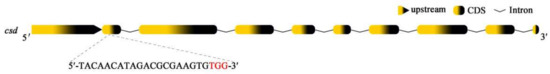 Diagram of the sgRNA targeting site in csd. The sgRNA targeting site is in exon 2. The PAM (protospacer adjacent motif) sequence is in red.