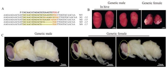 Haploid (unfertilized) male embryos only appear occasionally with a limited number during the swarming season [19], while fertilized eggs are almost constantly laid. After the swarming season, the males’ population in the colony decreases slowly and dwindles to zero in winter. Haploid males can also synchronously be laid by workers to pass along genes in a queenless colony [20,21]. Diploid males can be obtained in close inbred colonies by artificial insemination of the virgin queen with the semen of its son or brother drones [9]. Diploid males also can be available by knocking out fem in fertilized eggs through CRISPR/Cas9 genome editing technology [22]. The CRISPR/Cas9 system has the characteristics of high efficiency, simplicity, and low cost, thus ensuring it is a promising technology for studying gene function. So far, several genes’ functions have been studied in honey bees with this technique [22,23,24,25]. Because the genetic materials between males and females in honey bees are not identical due to the effects of ploidy, using CRISPR/Cas9 to produce diploid mutant males derived from fertilized eggs can better control the comparison of gene expression between males and females.