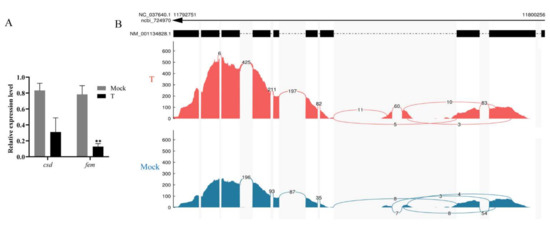 A total of 24 mRNA libraries were established. Over 90.70% of clean reads were mapped to the reference genome in each of them, and over 89.11% of uniquely mapped reads fell within known exons (Table S2). Both csd and fem were the down-regulated DEGs (FDR < 0.05) at 48 h AEL (Table S3). Csd and femF in the treatment groups showed significantly lower expression than the mock-treated groups, validated by qPCR (Figure 3A). However, there were more reads of fem’s first four exons in diploid mutant specimens than the mock-treated samples in the alternative splicing events analysis (Figure 3B). There is a premature stop codon in the male transcript of fem [15]. It is inferred that lots of femM transcript isoforms existed in the diploid mutant males.