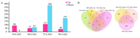 At 24 h AEL, catalytic activity, the metabolic process, the single-organism process, and the cellular process were the top four GO terms that annotated the most DEGs (Figure A4). At 48 h AEL, the up-regulated DEGs were specifically associated with signal transducer activity and molecular transducer activity. In contrast, the GO terms’ enrichment of down-regulated DEGs were uniquely involved in signaling, biological adhesion, and nucleic acid binding transcription factor activity. At 72 h AEL, the up-regulated DEGs were specifically annotated to two GO terms: multi-organism process and developmental process. The down-regulated DEGs were particularly enriched to fifteen GO terms. At 96 h AEL, the up-regulated DEGs were uniquely annotated to five GO terms: regulation of the biological process, biological regulation, multi-organism process, nucleic acid binding transcription factor activity, and organelle. The single-organism process, localization, and the cellular process, specifically, annotated the down-regulated DEGs. The top three GO terms were metabolic process, binding, and catalytic activity, at 48 h, 72 h, and 96 h AEL.