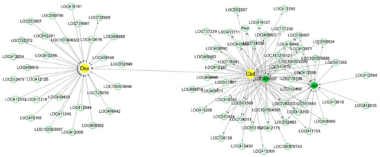 Co-expression network diagram with csd and dsx acting as the hub genes. csd and dsx were in the same module and the connectivity between them was very low. The description of LOC409022 on NCBI is fruitless (fru). Arrows point to downstream genes.