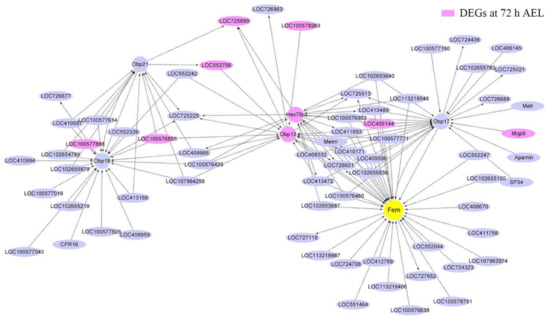 Csd, fem, tra2, and dsx, were divided into three modules; csd and dsx were in the same module. The interaction between csd and dsx was much more than that between csd and fruitless (fru) (Figure 5). Many genes located downstream of csd were also the downstream genes of fru. Forty-one up-regulated DEGs at 72 h AEL were in the same module fem located. Nine of them were shown in the co-expression networks graph that fem acted as the hub gene (Figure 6). Four odorant-binding protein (OBP) encoding genes, Obp13, Obp17, Obp18, and Obp21, were also included in the module. Obp13 was an up-regulated DEG at 72 h AEL. The co-expression networks showed that Obp13 and Obp17 had more intense relationships with fem than Obp18 and Obp21. Obp13, Obp17, and hexamerin 70c (hex70c) were the upstream genes of fem. A total of 29, 16, 87, and 24 DEGs belonging to 24 h, 48 h, 72 h, and 96 h AEL, respectively, were in the module tra2. There were six troponin (Tpn) family members, TpnII, TpnCI, TpnC IIa, TpnCIIb, TpnCIIIa, and TpnT. tra2 seemed to have an intense interaction with the Tpn family, especially TpnT, an up-regulated DEG at 24 h AEL (Figure A6).