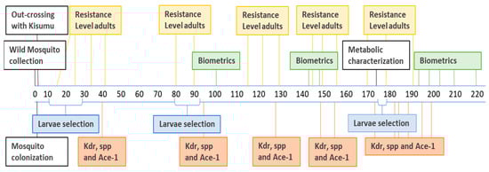 The timeline below, Figure 2, indicates the sequence of activities in this study across generations of An. gambiae Muleba-Kis.