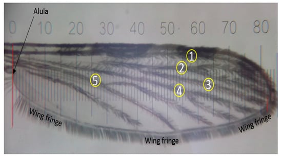 Image of wing aligned on a micrometer indicating the ocular gradations which correspond to the distance on the stage micrometer. Number 1–5 indicates the wing veins, where vein 3 is used for measuring the distance from the alula to the wing fringe (wing length). This photo was copied from PAMVERC Test Facility SOP with permission, originally taken and donated by MK (co-author).